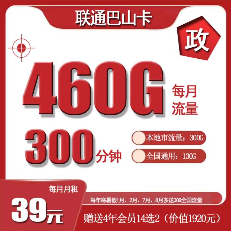 联通巴山卡39元300分钟130G全国+30G寒暑假+300G本地市【赠送双会员4年】