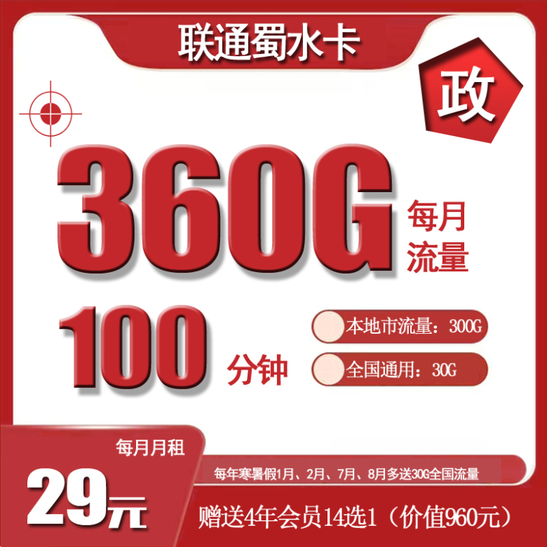 联通蜀水卡29元100分钟30G全国+30G寒暑假+300G本地市【赠会员权益4年】